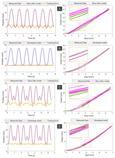 Comparison between the hysteresis models and experimental data using 1 Hz sine wave input signal (A,B) and combined frequency of 1 Hz and 1.5 Hz (C,D). (A,C) The symmetric Bouc–Wen model. (B,D) The developed asymmetric hysteresis model given by Equations (1) and (2).