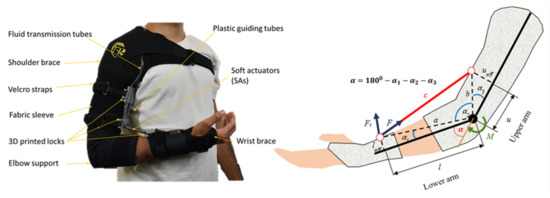 Over the past two decades, an increasing number of academic and industry groups have dedicated themselves to their work on the development of upper limb exoskeletons for rehabilitation and power augmentation applications [1,2]. Physically weak individuals due to aged, injured, or handicapped situations have been identified as the primary beneficiaries of this technology. The growth of exoskeleton technology has also been prompted by an endeavor of the current healthcare system to benefit stroke victims, who often experience the chronic impairment of upper limbs, with an optimum rehabilitation therapy [3,4]. The individuals, who suffer from partial or full loss of motor function, tend to lose their ability to perform basic activities of daily living (ADL), which causes their independence to be restricted and their quality of life to be significantly degraded. Rehabilitation intervention can be helpful in these cases when it comes to helping them regain various motor skills [1,2,5,6]. In fact, it has been proven that upper limb exercises that are highly intensive and task-specific, such as active and repetitive movements, are the most effective methods of therapy for stroke victims to restore their arm function [7]. Assistive robots are able to provide this kind of training, allowing patients to semi-autonomously practice their movements, thus facilitating the therapist’s job [8,9]. Several clinical studies revealed the positive effects of robot-assisted rehabilitation, which are found to be at least as effective as conventional intensive therapy [10,11,12]. Although rigid exoskeleton systems are beneficial for applications requiring high force/torque transmission, or where portability is not a necessity, such as in the case of on-site rehabilitation [13], their large size, high weight and rigidity make this design archetype suboptimal for everyday use. In addition, the lack of compliance with the wearer’s body poses safety concerns and can cause discomfort during the human–machine interaction. The practical challenges faced in translating lab-based rigid-bodied systems for real-world applications have driven the research to a new design philosophy that sees the replacement of external rigid frames with soft, clothing-like frames. The resulting soft-bodied exoskeletons display some significant advantages, such as reduced weight, low profile, and increased comfort. These are key requirements for assistive wearable robots that are designed to facilitate the functional movement of the wearer during ADLs [14,15,16].