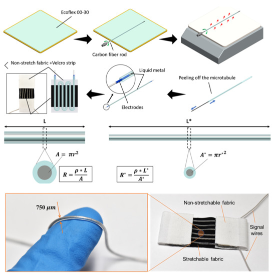 The fabric strain sensor works as a piezoresistive sensor, where its length change corresponds to the change of its resistance defined by , where the liquid metal resistivity , A is its cross-sectional area, and L is its length. Upon the elongation of the muscles, the fabric strain sensor also increases in its length, from L to L*, and decreases in its cross-sectional area, from to , where are the radius of the liquid metal channel of the sensor. This deformation results in a change in the sensor resistance, from R to , as depicted in Figure 7.