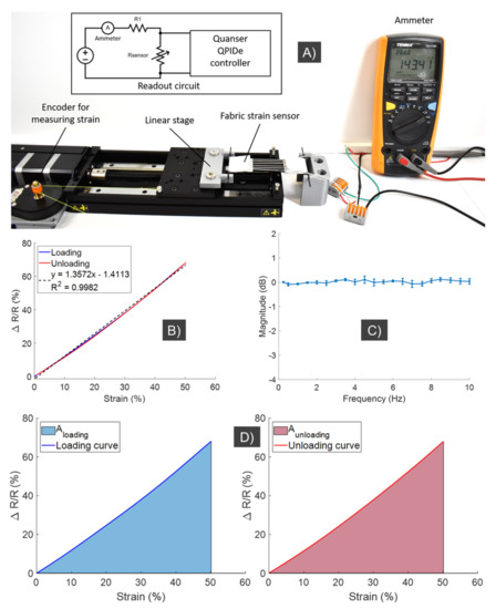 The fabric strain sensor was first characterized in a separate experiment, with a setup depicted in Figure 8A. The inset image of Figure 8A describes the schematic of the readout circuit that was used to acquire sensor readings. Using this experimental setup, the fabric strain sensor was subjected to elongation (loading) and retraction (unloading) cycles at 0.2 Hz by an automated linear stage (Zaber Technologies Inc., Vancouver, BC, Canada). The relationship between normalized changes in the resistance, , of the sensor and its strain was collected and displayed in Figure 8B. In order to characterize the hysteresis in the sensor response, the degree of hysteresis (DH) is quantified by the following equation: