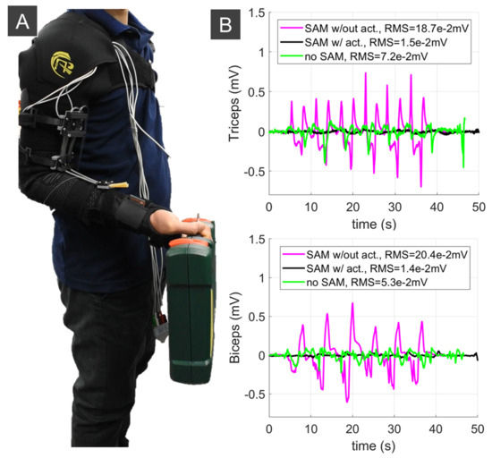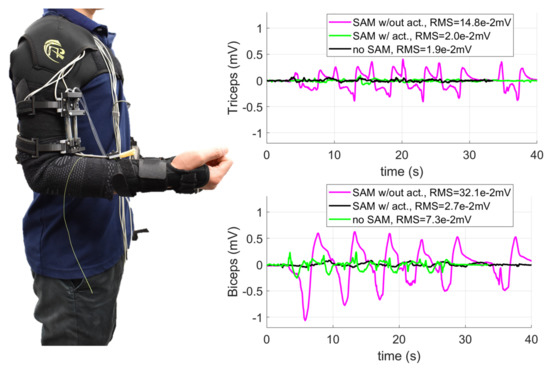The results in Figure 9 and Figure 10 indicate that the soft robotic sleeve reduced the workload of the subject’s biceps and triceps compared to the configurations with no SA, and without actuating the SAs. For example, without lifting any load, the root mean square error (RMS) for the triceps and biceps was reduced around 7 times (from RMS = 0.148 mV to RMS = 0.02 mV) and 12 times (from RMS = 0.321 mV to RMS = 0.027 mV) if the soft robotic sleeve is activated, respectively. For experiments when the wearer held a load, there was a significant reduction in the RMS (around 12.5 times for the triceps from RMS = 0.187 mV to RMS = 0.02 mV and 14.5 times for the biceps from RMS = 0.204 mV to RMS = 0.014 mV) once the soft robotic sleeve was activated. It is noted that the first configuration (i.e., SA w/out act) had significantly higher muscle activation, because the wearer’s arm not only had to carry the 1.8 kg weight, but also resist the non-actuated SAs.