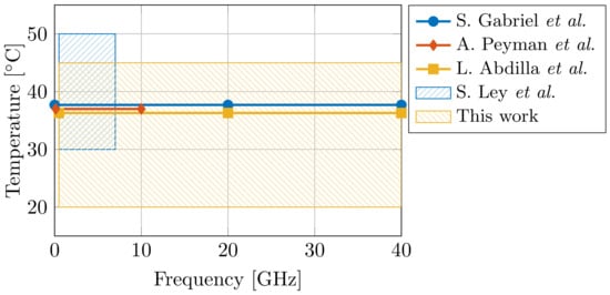 Comparison of the operating temperature and frequency range of dielectric models for muscle tissue [19,22,23,24] from state-of-the-art literature.