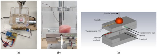 The measurement setup is built upon our previous work with a strong focus on actively controlling and monitoring the temperature of the sample, the dehydration rate of the investigated sample, and the applied probe-to-tissue contact pressure [30,31]. After the aforementioned heating in the water bath, the sample is placed on the heated platform, as shown in Figure 2.