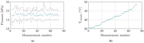 At the 8 set temperatures, 3 samples were measured at 3 locations, which resulted in a total of 72 measurements. Throughout these 72 measurements, the environmental conditions and confounders were closely monitored. The humidity and temperature sensor measured a relative room humidity of 71.4 ± 0.9% and a room temperature of 20.6 ± 0.4 °C throughout all measurements. The controlled measurement setup probed the tissue sample with a controlled probe-to-tissue contact pressure of 14.6 ± 0.61 kPa, and the average contact pressures with their corresponding standard deviation are shown in Figure 3a. Furthermore, the actual sample temperatures are shown in Figure 3b.
