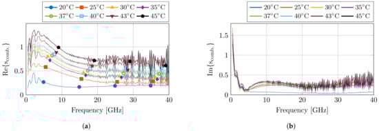 In addition, the aforementioned crossover frequency of the model is clearly present around 6.5 GHz. However, due to the conciseness of the model, the crossover appears at a single frequency point, whereas a broader crossover zone is observed in measurements in the 6.5–10 GHz frequency band. Nevertheless, the temperature-dependent dispersion of pure water exhibits a similar broad crossover zone [7]; therefore, this broader crossover zone is expected, as well for high-water content tissues, such as muscle tissue, in this work.