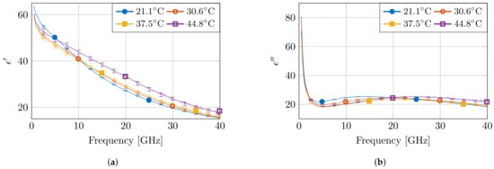 Furthermore, the Cole–Cole parameters can depend on tissue temperature, as first proposed by M. Lazebnik et al. for liver tissue [21] and later extended to blood, muscle, and fat [24,43]. This work conducted measurements in the 0.5–40 GHz frequency range. Here, the dispersion is dominant [44] and clearly visible in the presented data (Figure 5). Furthermore, the tail of the dispersion is present and causes the steep decrease in permittivity for increasing frequency that can be observed in the 0.5–2 GHz frequency range. Therefore, it sounds reasonable to fit the measured data with a two-pole Cole–Cole model. Nevertheless, a single-pole Cole–Cole model will be presented since the measured frequency range does not offer the required information to properly model the second dispersion. The dispersion is present in the 0.1 MHz to 2 GHz range () compared to the measurement range of the 0.5–40 GHz, and it causes a change from 7000 units of permittivity () compared to the monitored difference of only 10 units in the tail [19]. Therefore, the obtained information regarding the dispersion is, in our opinion, too scarce to accurately represent it. It would be possible to fit this dispersion, but, in our opinion, it would be a purely numerical operation. Moreover, the fitting would be numerically unstable and would produce fitting parameters (, , and ) with little to no physical meaning. As a consequence of ignoring this dispersion, the single-pole model will have a somewhat skewed dispersion to compensate for the missing dispersion. This translates in lower , and higher and values to compensate . Similarly, an increase in balances out the missing dispersion in .