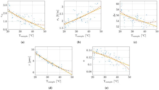 Therefore, the single-pole Cole–Cole model was selected and will be used throughout the remainder of this work. The nonlinear least-squares optimizer from MATLAB, using the Levenberg–Marquardt algorithm, simultaneously fitted the real and imaginary permittivity data for each measurement while optimizing the five single-pole Cole–Cole parameters (, , , , and ) [45]. The extracted Cole–Cole parameters are presented as a function of sample temperature in Figure 6. Additionally, they are fitted with a first () and second order polynomial (), which are added in the same figure. The corresponding polynomial parameters are given in Table 1. As is clear from Figure 6, the small coefficients of the quadratic term, and the limited difference in the values, the added complexity of the second order polynomial is not worth the limited improvement in the obtained fit. Therefore, a linear fit as function of sample temperature for the Cole–Cole parameters will be used from here on. This results in the following temperature-dependent dielectric model: