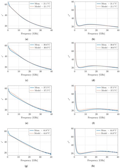 Figure 7 presents the modeled dielectric properties at four temperatures, and the results are very close to the measured properties in Figure 5. However, at low frequencies, a discrepancy is present between the model and the measurements. Due to the lack of a second dispersion in the presented model, the steep decrease in the measurements cannot be captured in the model. Therefore, a second order fit was performed following the same approach as specified above. Both models have a similar error overall, apart from the clear difference at low frequencies in the first order model due to the absence of the dispersion. This improvement is also present when evaluating the root mean square error (RMSE) of the real and imaginary part of the permittivity over all frequencies for all measurements. An RMSE of 0.7354 is obtained for the first order model, whereas this RMSE is reduced to 0.3144 in the second order model. However, this improvement comes at the cost of increased numerical instability, and the presented parameters would have little to no physical meaning.