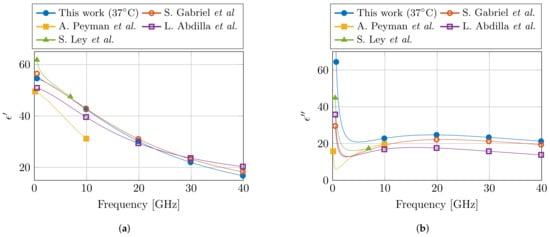 Comparison of the proposed dielectric model of muscle tissue at 37 °C with the models from literature in the corresponding frequency range. The real and imaginary part of the permittivity are shown in (a,b), respectively. (Literature data from S. Gabriel et al. [19], A. Peyman et al. [22], L. Abdilla et al. [23], and S. Ley et al. [24].)