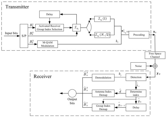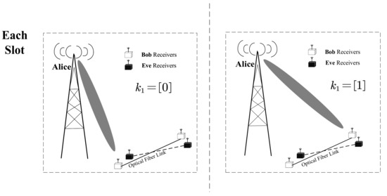 At the transmitter, unlike traditional SDM, the activated receiver index is carefully conceived to hide the real index information, while Eve still deems it to be a conventional spatially modulated antenna index. To elaborate a little further, from the bitstreams’ perspective, a block of bits is divided into three parts. First, the indexes of Bob’s distributed receivers are partitioned into two groups, namely and , with and . Then, the first bits are utilized to select the receiver group. For example, if , the receiver group index at the k-th data block retains the same one as the previous. Otherwise, the receiver group index will be different. According to this special mapping rule, let us assume that the selected receiver group at the -th data block is , i.e., , and then the receiver group at the k-th data block can be obtained as:
