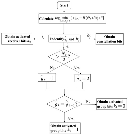 where returns the remainder after division of b by a. Finally, is capable of being demapped into the receiver index bits. Figure 4 depicts a flowchart of the aforementioned detection algorithm.