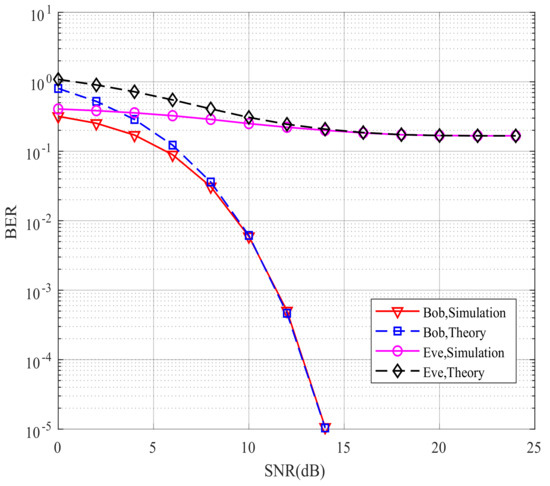 Figure 6 compares Bob’s and Eve’s theoretical and simulated BER performance for the proposed CIM-SDM scheme in the context of . If the theoretical curves provide a good approximation to the simulated ones, we can validate the effectiveness of the theoretical analysis and use the theoretical analysis to evaluate the system performance in future work. By comparing the curves in Figure 6, we made the following observations. First, in CIM-SDM, the theoretical curves of Bob and Eve form a tight upper bound of the simulated curves at a high signal-to-noise ratio (SNR). Meanwhile, the theoretical curves of Bob and Eve are reachable as the SNR increases. Similar trends are also valid for Figure 7, where , which further validates the effectiveness of the theoretical analysis of (26) and (30).