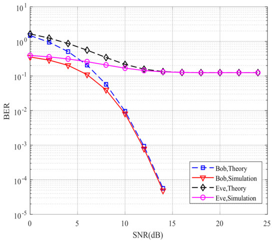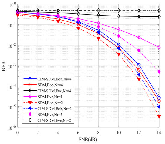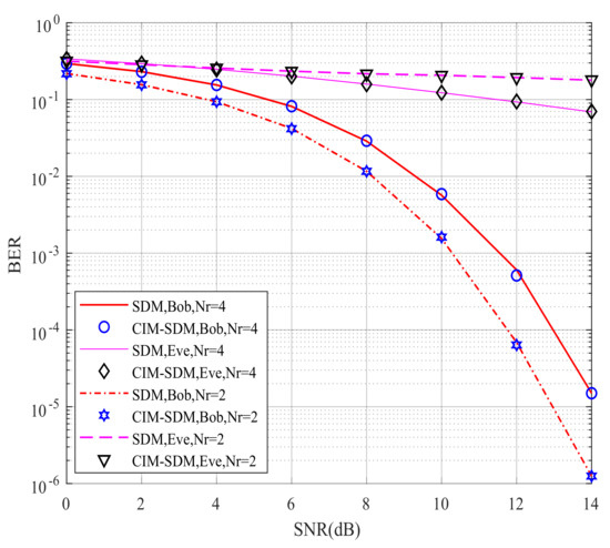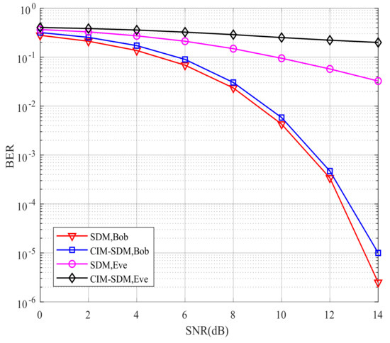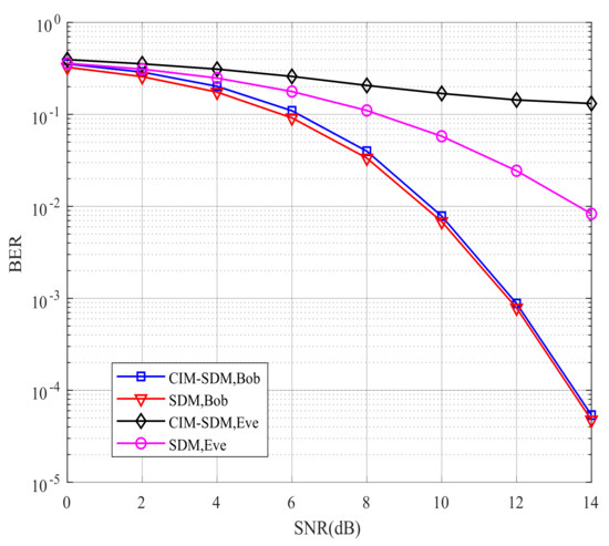 Having validated our theoretical analysis using Figure 6 and Figure 7, we further illustrate the BER performance of the proposed CIM-SDM scheme compared with the traditional SDM scheme in Figure 8 and Figure 9. As shown in Figure 8, for Eve, the proposed CIM-SDM system provides worse BER performance than the SDM scheme. More specifically, in CIM-SDM, Eve approximately exhibited a 6 dB performance loss at a BER of 10−1 compared with the traditional SDM. What is more, the BER performance of Eve almost stayed at 0.5, which means that it was difficult for Eve to decode the information correctly in the context of CIM-SDM. Another important observation inferred from Figure 8 is that the CIM-SDM scheme exhibited slight performance loss compared to that of SDM. The reason for this degradation was that the original bit demodulation was associated with the previous and present data block, as we analyzed in (23) and (24).