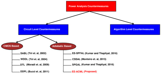 Novel design techniques such as adiabatic logic are promising to both reduce energy consumption and defend against a type of side-channel attack known as power analysis attacks [9]. Adiabatic logic reduces the dynamic energy consumption of a circuit by recycling stored charge in the load capacitor back into the clock to be used again [10]. Furthermore, dual-rail adiabatic circuits can be designed so that the circuits are balanced and power consumption remains uniform preventing information leakage [9]. Figure 1 shows the categories of countermeasures against Correlation Power Analysis Attacks (CPA).