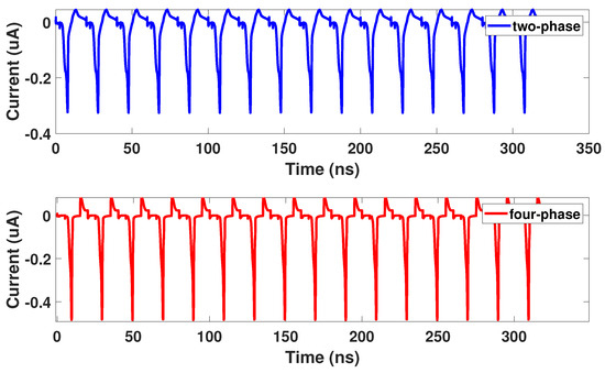 Side-channel attacks attempt to steal information from a device’s inherent characteristics such as power consumption [5], timing [6], etc. In this article, we will focus on side-channel attacks in the form of power analysis attacks. Of the power analysis attacks, the Correlation Power Analysis Attack (CPA) is widely used because of its ability to target both symmetric and nonsymmetric cryptographic algorithms [21]. Different inputs of a circuit will result in different power consumption [5]. With this information, an attacker can measure hundreds of thousands of power profiles with controlled inputs to steal the secure encryption key. Masking and elimination are two methods to defend against power analysis attacks [22]. Masking aims to minimize correlation between data and power consumption such as in the proposed Bus-Invert Coding [23]. To defend against the CPA attack, we designed our circuits using a technique known as elimination [22]. Elimination aims to remove any variations in power consumption, so that each operation has uniform power consumption and thus no information leakage. An example of uniform power consumption can be seen in Figure 3, which shows the uniform current of a two and four-phase adiabatic gate.