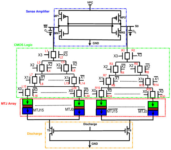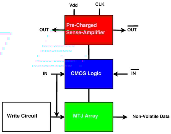 MTJ integration with CMOS structures has been implemented in previous work [16]. Figure 5 shows the generalized form of an existing version of a CMOS/MTJ circuit. The architecture contains the following components: a Pre-Charged Sense Amplifier (PCSA), a dual-rail CMOS logic tree, an MTJ array, and a writing circuit to switch the state of the MTJs when the inputs are changed. CMOS/MTJ circuits that switch frequently are not energy-efficient because of the substantial energy required to write to the MTJs [27].