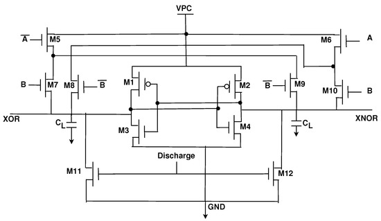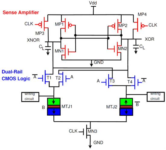 The operation of the PCSA can be explained through the existing PCSA-based CMOS/MTJ XOR gate (Figure 6) [16,28]. The PCSA has two stages depending on whether the clock is at logic 0 or logic 1. When CLK is at logic 0, MP3 and MP4 are both on and thus the outputs are pre-charged to logic 1. When CLK is at logic 1, MN3 is turned on and the outputs begin discharging to ground. One MTJ will be in the parallel state and the other MTJ will be in the antiparallel state, this results in a difference in resistance and thus the discharge speed will be faster through one MTJ. As an example, let us assume MTJ1 is in parallel mode and MTJ2 is in antiparallel mode. In this case, and as a result more current will flow through MTJ1 than in MTJ2. When the XOR node reaches the turn-on voltage of MP2, XNOR will be charged to logic 1 and XOR will be discharged to logic 0 through MN1.