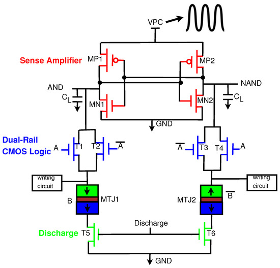 Along with adiabatic logic, novel devices such as Magnetic Tunnel Junctions (MTJs) can also be used to design low energy and secure circuits [15]. MTJs are nonvolatile storage units that have low standby power, high integration density, and easy compatibility with CMOS [16,17,18]. MTJs can be added to CMOS structures to form nonvolatile ultra-low energy circuits [19].