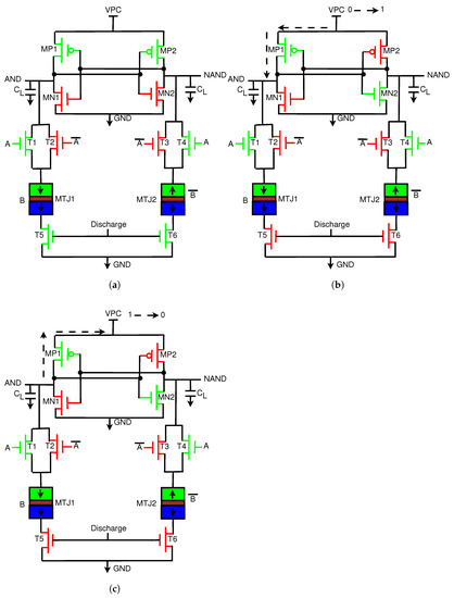 Operation of the proposed Energy-Efficient Adiabatic CMOS/MTJ AND/NAND gate. (a) Discharge stage of operation; discharge = 1, VPC = 0, A = 1, B = 1. (b) Evaluation phase of operation; VPC = 0 -> 1, discharge = 0, A = B = 1. (c) Recovery phase of operation; VPC = 1 -> 0, discharge = 0, A = B = 1.