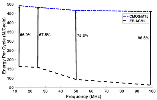 Energy per cycle comparison between proposed EE-ACML and CMOS/MTJ.