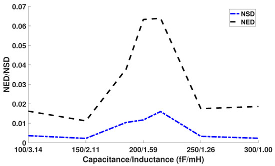 The adiabatic clock generator can also affect the security of our adiabatic CMOS/MTJ circuit. We varied the inductor and capacitor to determine the effect it has on Normalized Energy Deviation and Normalized Standard Deviation. The results can be seen in Figure 16. From Figure 16, we can see that the NED and NSD values peak at certain inductor and capacitor values. We theorize that this is a result of the RLC power clock generator having higher power consumption at these inductor and capacitor values thus causing more variation in overall power consumption. We conclude that there is a certain capacitor and inductor value that will result in a more robust countermeasure against CPA attacks.