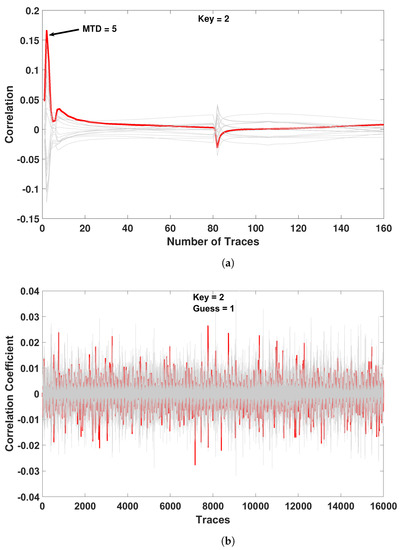 Correlation power analysis performed on EE-ACML implementation of PRESENT-80. (a) Successful CPA attack on CMOS-based implementation of PRESENT S-box with key = 2. (b) Unsuccessful CPA attack on EE-ACML-based implementation of PRESENT S-box with key = 2.