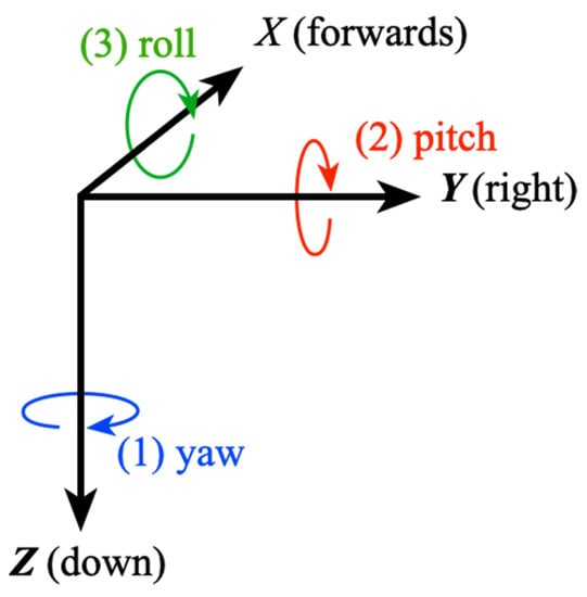 In the fixed frame of reference comprising x, y, and z axes, it is conventional that the z-axis points down. In the earth’s FOR, x is north and y is east. The rotations are generally considered as executed intrinsically on an object with principal axes X, Y, and Z that start aligned with the FOR axes, with X representing forwards, Y to the right, and Z down.