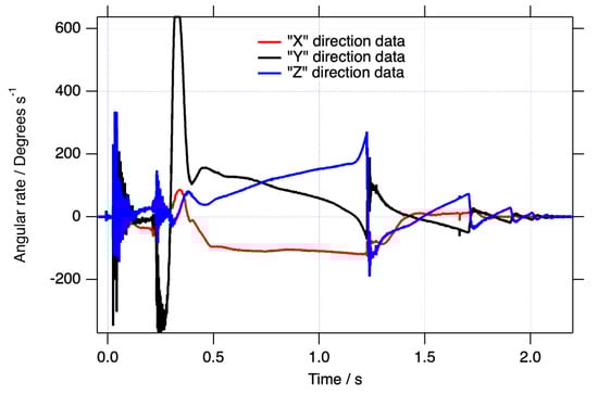 The 6-axis sensor includes three orthogonal accelerometers with a range of ±2000 g and three angular rate gyros on the same axis orientation with a range of ±300 degrees/s. Data were recorded at 100 kHz and low-pass filtered using the recommended filter in the DTS control software prior to export as comma-separated with ASCII text files. Analysis and animation of the results were undertaken using the Igor software suite (www.wavemetrics.com (accessed on 11 November 2021)) although other common packages, such as Matlab or Python, could also be used.