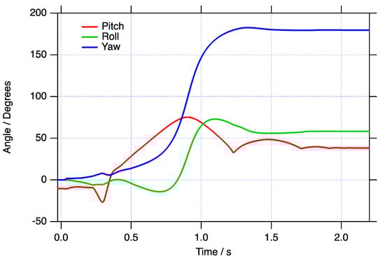 The raw angular rate data in the sensor’s FOR for the blast loaded object are shown in Figure 2. The brief positive saturation at approximately 0.35 s was not found to affect the measured final resting orientation compared with the calculated one by a measurable amount (<3°). Figure 3 shows the roll, pitch, and yaw of the object over the motion time of approximately 2.05 s after applying the quaternion data reduction scheme described above. Although it is clear from inspection that the object yawed almost 180 degrees during the test before coming to rest, and from the pitch curve, that it gently bounced several times, it is difficult to intuitively translate this type of data into a physical interpretation of the motion. Of course, the raw data displayed in Figure 2 are even more difficult to interpret.