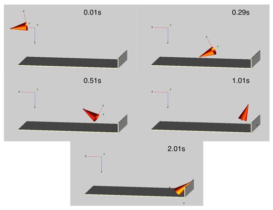 Selected animation frames showing the motion of the test object being thrown into the soft-catch pit. Time of 0.01 s shows the initial location prior to movement and 2.01 s shows the final resting location.