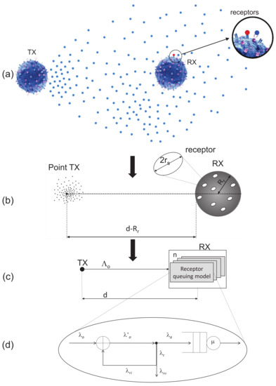 The proposed system model is sketched in Figure 1. This figure illustrates all the logical steps staying behind the definition of our model. First, Figure 1a illustrates the physical model in which a transmitting nanomachine, the TX, releases a number of ligands in the surrounding 3D environment. Through the propagation by diffusion, these ligands can reach the receiving nanomachine, the RX node, which is equipped with a number of different receptors. Only compliant receptors can bind with the released ligands. This behavior is typically modeled in molecular communications literature as a point TX, releasing particles that diffuse through the surrounding 3D environment, and a spherical RX, whose surface is covered by circular receptors of radius , as illustrated in Figure 1b (see, e.g., in [15]). We further model this system as a set of queues, one for each receptor. We make the simplified assumption that all receptors are virtually located in the same point, as we prefer avoiding to make specific assumptions on the position of receptors on the RX surface [16] (Figure 1c). Finally, Figure 1d represents the single receptor service system through the well-known M/M/1/1 queue. The use of queuing models for molecular communication systems is not new, as shown in [9,11,17]. The original aspect in this paper is that it is used to develop a simplified model to be used in large-scale simulations, that represent a challenging task when such systems are analyzed. We model a receptor as a server with an exponential service time (trafficking time) with mean to .