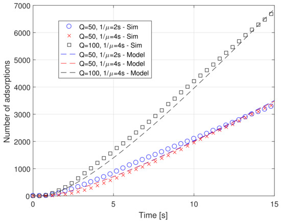 As for the simulated system, we can see that the impact of the trafficking time on the number of absorptions is almost negligible for Q equal to 50. This is true for both the proposed model and for the simulations. This means that the system is still not in saturation and any variation of the absorption time does not impact in a significant way. However, this is not completely true for rejections. In fact, an increase of the absorption time () decreases the time during which the serving system, that is, the receptor, is available to form a new bond. Thus, increasing implies increasing the number of rejections, as can be appreciated in Figure 3. When the emission rate increases, that is, Q becomes equal to 100, the effect on the number of absorptions becomes evident. In fact, increasing the release rate means increasing the concentration of ligands in the surrounding space and thus also close to the RX surface, and with a doubling of the arrival rate. The net effect is a doubling of the number of absorptions, meaning that the system is still not completely saturated. However, the number of rejections increases in a more significant way. For instance, considering the scenario with , at the simulation time the rejected molecules number ~200 for , whereas they jump to slightly less than 1000 for .