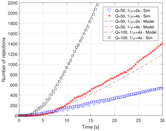 We can comment the two figures together, as they present very similar results. In particular, they show a very good agreement between the proposed model and simulation results in terms of both absorption and rejection rates for different values of system parameters Q and .