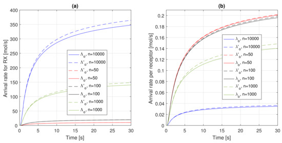 Arrival rates as a function of time for different values of the number of receptors, n: (a) and , and (b) and .