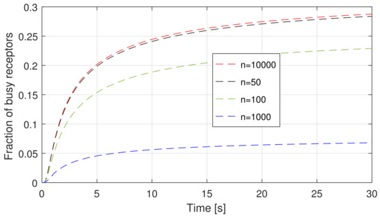 In addition, a further comment is about the impact of the capture probability on . In fact, for very low values of n, we have already mentioned that is negligible, thus we do not expect a significant difference between and . This is confirmed by Figure 5b. Clearly, when , this values begins to be relevant for , but for further increments, it follows an opposite behaviour. This is due to the fact that, even if takes large values (about 0.65 for 10,000) with a much larger number of receptors, the probability for a ligand to find a receptor not busy and thus available to form a bond is larger. Thus, the impact per receptor of starts becoming less important. This is also confirmed by a further metric, the average number of busy receptors () as a function of time, which is plotted in Figure 6. In fact, it is evident that, by keeping the generation rate constant, if the system capacity increases (i.e., n), the load of the system, normalized to its capacity, decreases.