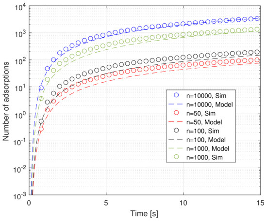 Finally, Figure 7 shows the results needed for assessing the suitability of the model in matching particle-based simulations for very low values of the number of receptors n. It is quite evident that the proposed model is able to match the simulation results quite well. In order to make the comparison more evident, we used the logarithmic scale in the ordinate axis. Again, we can appreciate the fact that simulations are closely matched not only in the steady state, but also in the transient state. The small difference between the values obtained by using the model and those resulting from particle-based simulation is the cost of having a lightweight yet accurate model. It is based on some approximations to make it not only treatable, but also easy to simulate, instead of using time-consuming, full-fledged particle-based simulations.