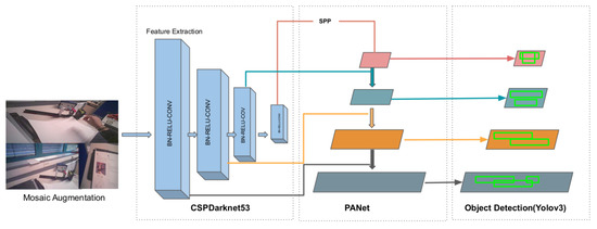 YOLO v4 is the upgraded version of YOLO v3 and is significantly faster and more accurate. Various additions and modifications have been made to the network that contribute to its efficiency. YOLO v4 consists of CSPDarknet53 [43] as a backbone. CSPDarknet53 is a feature-extraction network, which splits the input into two parts. One part goes through DenseNet and the other part does not go through any convolutions. Due to its increased receptive fields, Spatial Pyramid Matching (SPP) [44] and Path Aggregation Network (PAN) [45] are used as Neck. The SPP layer performs maxpooling to generate fixed size output representations, and is used after the feature extraction to avoid the limitation of a fixed size input requirement. The role of the neck is to aggregate features from different stages. The SPP block is added over the CSPDarknet53, since it separates the most significant context features and causes almost no reduction in the network operation speed [14]. Due to the high abstraction of information in the higher-level features, it is difficult to make predictions for each pixel. PANet helps the information flow by performing pooling at different levels, thus preserving spatial information [14]. YOLO v3 is used in the third stage as the head, where the usual object detection and localization occurs. A new data augmentation method is used, called mosaic, which mixes four different training samples. This reduces the need for large mini-batches and provides better object features. Another augmentation method used is Self Adversarial Training (SAT). SAT alters the training image and trains the network to identify objects in the altered image. Besides these new additions to the network, several other modifications were implemented to improve the efficiency of the model [14]. An overview of the YOLO v4 architecture can be seen in Figure 4.