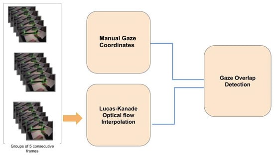 The Lucas-Kanade method has previously been used for eye-tracking [47]. In our method, we also used this feature-tracking method to track similar features over consecutive frames for a bounding-box interpolation (see Figure 6). The entire set of video frames was divided into chunks, where a single chunk comprised five consecutive frames. The interpolation was performed within every chunk, and each chunk was independent of the other chunks. We chose five frames, based on the assumption that a fixation on one spot lasts at least 200 ms, which corresponds to five consecutive frames considering a frame rate of 25 Hz. We used this argument for the fixation duration because it is an indicator of how rapidly the environment changes, even though a fixation itself is not related to the interpolation of bounding boxes. We also varied this number of five frames within one chunk and verified that five frames led to the best performance of the algorithm. Chunks comprised of blurred frames were ignored during the interpolation. The blurred frames were identified using the variance in the Laplacian method. We also used a threshold of five frames to catergorize blurred images. In this way, the gaze was assigned to all frames, including the false negatives (see Figure 6). If there were five or more blurred images in a row, we discarded the bounding box. Models such as Deep Sort were not used, since they are used for the tracking of single objects and are more suitable for radar data. Using such models could lead to a high number of false-positive identifications.
