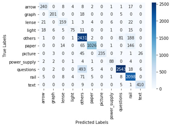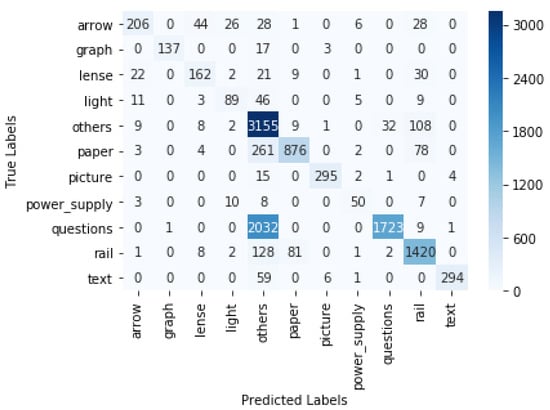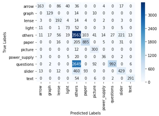 The objects were detected using the trained models. The gaze coordinates that were originally extracted from Tobii Pro Lab were used for estimating where the participant was looking at a certain timestamp. If the gaze coordinates were within the bounding box of an object A in the ith frame, we concluded that the participant was focusing on object A in the ith frame. In this way, we could determine the fixation (location where a person was focusing on) in each frame and, as a result, obtain a time series of all participants’ fixations. This time series data could, for example, be used for analysing the study patterns. The predicted fixation was compared with the ground truth fixation. The ground truth was obtained by manually looking at each video frame and recording the objects on which the gaze was focused at each timestamp. For the YOLO v4 model, the macro-precision score was 0.89 and the recall was 0.83. For the Faster R-CNN, the macro-precision score was 0.83 and the recall was 0.73. The confusion matrix for YOLO v4 with interpolation is displayed in Figure 7. In the case of YOLO v4, the true gaze was on the rail but predicted as "Other" 79 times, and it was predicted as paper 5 times. The interpolation of the boxes led to a significant increase in accuracy. For YOLO v4, we show the results without the interpolation step in Table 1 and the confusion matrix in Figure 8. There was an increase in the weighted F1 score, from 0.58 to 0.87, after interpolation. The confusion matrix of the Faster R-CNN can be viewed in Figure 9. For the Faster R-CNN, the gaze was on the rail but was predicted as “Other” 125 times and predicted as paper 62 times. This might be due to the closeness of these objects in the experimental setup (see Figure 2). The results for all objects for YOLO v4 and Faster R-CNN can be seen in Table 2 and Table 3; micro averages calculate the average of the contribution of all classes, which is useful for imbalanced classes and corresponds to the algorithm’s accuracy, whereas macro averages estimate the average across class averages, independently of their contribution, and weighted averages weigh the average by the number of samples in each class. Since the bounding boxes did not have irregular shapes, the overlapping of bounding boxes could not be avoided. We also tried to change the angle of the rectangular bounding boxes based on the angle change in the scene. However, this did not lead to any significant increase in the accuracy.