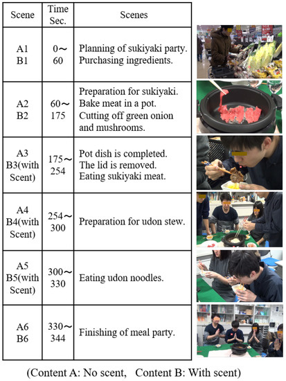 Figure 3 shows food videos based on “sukiyaki” used in the experiment. The story was created with reference to the popular Japanese gourmet TV program “Solitary Gourmet, Season 5, Episode 12” [30]. According to timely research, “sukiyaki” is the most popular hot pot dish among Japanese people [31]. The video consists of six scenes and runs for five minutes and 44 s in total. In scene 1, performers plan to have a sukiyaki party and buy foodstuffs for sukiyaki at the supermarket. This is a familiar scene everyone experiences at home, and the subject’s appetite is expected to be weak. In scene 2, they grill meat in the pan, adding sukiyaki sauce and cut vegetables. Thus, they start cooking with a lid on the pan. In this scene, the “sukiyaki pan” impresses us so concretely that it is expected to enhance our appetite little by little. In scene 3, when the sukiyaki is ready, the lid is removed. Four performers pick up meat and vegetables with chopsticks one after another for consumption. At this point, it is expected that the subject will imagine a good scent and generate a strong appetite. In scene 4, a ball of udon noodles is put in the soup remaining in the pan after all the foodstuffs of sukiyaki are consumed. As it is a common cooking scene, it is expected rather suppress appetite compared to the meal scene. In scene 5, performers eat udon noodles. This scene is expected to stir up a strong appetite again. Scene 6 includes a greeting after the sukiyaki party. We labeled the video without scent as content A, and that after scene 3, including sukiyaki scent, as content B.
