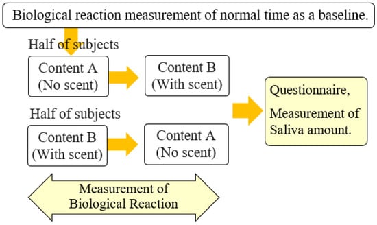 The subjects were 10 Japanese university students aged 21 to 22 years (5 males and 5 females) who participated in the experiment more than 2 h after the previous meal and before the next meal. Contents A and B differ in the presence or absence of scent, but in order to prevent the displaying order of videos from influencing the result, the subjects were randomly divided into two groups (five subjects per group). One group watched the video in the order of A to B, while the other watched B to A. The experiment data for ten subjects were gathered and statistically processed.