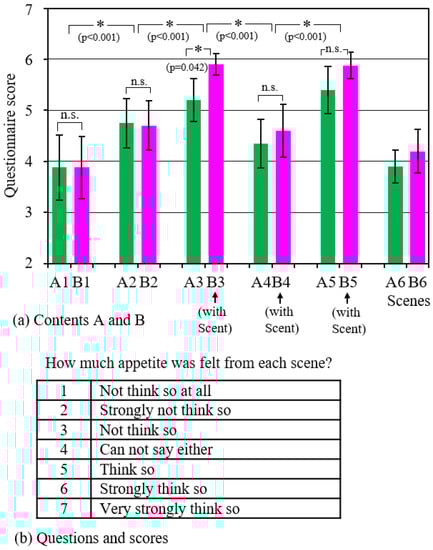 Figure 5 shows the results of the questionnaire about the abovementioned appetite in each scene immediately after watching videos. Figure 5a shows mean values and standard deviations of the evaluation scores, and Figure 5b shows the questionnaire. A1 to A6 show the six scenes in content A, while B1 to B6 show the scenes in content B during which scent was displayed. Differences in mean values were tested at a significance level of 5% using two-way ANOVA with scene and scent factors. IBM SPSS Statistics was used for the analysis. There were five levels of scenes (scenes 1 to 5) and two levels of scent (with/without). Scene 6 was excluded from the analysis because it is not directly related to cooking and eating. Therefore, it was a test of the difference of 10 groups in total. As a result, the difference between the mean values due to both factors became clear (scene: F(4,90) = 49.5, p < 0.001, scent: F(1,90) = 8.52, p = 0.004). In addition, one-way ANOVA showed that there were differences in each group (F (9,90) = 23.9, p < 0.001). Furthermore, Tukey’s method was used for multiple comparisons. Combinations with clear statistical differences are indicated by *. N.s. is a combination where the difference was not statistically significant because p > 0.05.