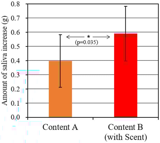 As seen in Figure 5, each content includes some realistic scenes in which appetite was strongly felt. Moreover, in content B, during which the scent was presented, the appetite was higher. As shown in Figure 6, the saliva flow rate actually increased, consistent with this result. In the future, if the saliva flow rate and the components are measured for each scene, a more detailed relationship with appetite may become clear.