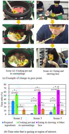 Figure 7 shows the results of measuring gazing points while the subject was watching the content. An example of gaze-point change is shown by a group of red dots in Figure 7a. In scene A2, the subject’s gaze focused on the pot and moved, as if they were looking for their favorite ingredients. In scene A3, the gaze points of the subject followed the action of a performer who picked up a slice of meat with chopsticks, put it in the egg, and chewed it in the mouth, without paying attention to anything else.