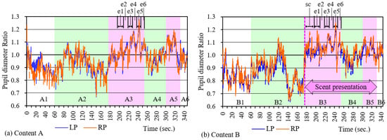 Figure 8a,b show an example of a change in pupil diameter during the time a subject watched contents A and B, respectively. Blue color (LP) shows the pupil diameter of the left eye, while red (RP) shows that of the right eye. There is not a big gap between them, and their movement seems almost the same. In the beginning of scenes A2 and B2, where cooking started and meats were thrown into the pan to be grilled, a temporal mydriasis occurred, and a surge of interest with tension and excitement was considered. Then, after a while, miosis occurred during the part of the scene where the vegetables were cut, put in a pot, placed under a lid and left to boil. In scenes A3 and B3, where the pan lid was taken off and three performers ate one after another (1st performer: e1, e2, 2nd performer: e3, e4, 3rd performer: e5, e6), a large extent of mydriasis was observed. As for B3, which displays scents in conjunction with the opening of a lid, mydriasis was remarkable. “sc” in the figure shows the reaction of starting scent presentation. Looking at B3 in detail, large mydriasis occurred multiple times during scenes e1, e3, and e5, where the meats were put in the three performers’ mouths. Miosis occurred multiple times during scenes e2, e4, and e6, where the actor was chewing. In this way, even during a scene that tends to have mydriasis as a whole, it can be seen that mydriasis and miosis were repeated in a short time, reflecting the video content. At this moment, many subjects, including the above one, gave a finger sign (mentioned above) indicating that they felt saliva secretion. In scene 4, where udon was prepared to cook in the soup, miosis was again observed, while during scene 5, where they ate udon, the abovementioned mydriasis was observed.