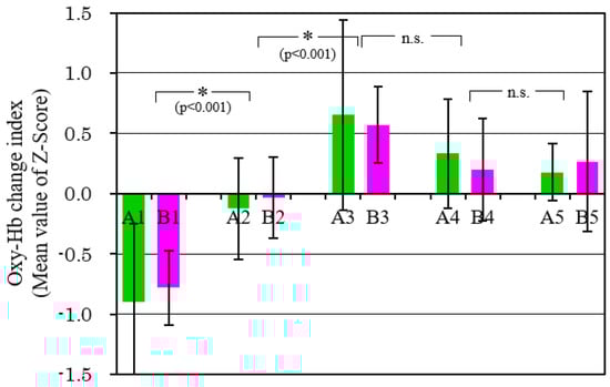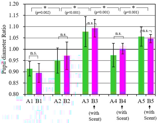 Figure 9 shows the mean value and standard deviation of the pupil diameter change ratio of all the subjects from scenes 1 to 5. The difference between these mean values was tested at a significance level of 5% using a two-way ANOVA with scenes and scents as factors. As a result, the difference in the scene (scene; F(4,90) = 49.2, p < 0.001) was confirmed, although no statistically significant difference was confirmed in terms of with or without scent (scent; F(4,90) = 0.64, p = 0.426). Combinations in which statistically significant differences between scenes were affirmed using the multiple comparison method are indicated by * in the figure. Also, n.s. indicates the combinations where a statistically significant difference could not be confirmed because p > 0.05. From this analysis, it was found that the pupil diameter changed to reflect the content of the scene. In the cooking scenes (A2, B2, A4), the rate of change in pupil diameter was 1.0 or less, so the pupil tended to be miotic. During eating scenes (A3, B3, A5, B5), mydriasis tended to occur, as it was 1.0 or higher. It seems that excitement and tension temporarily occurred during scenes 2 to 3 and scenes 4 to 5.