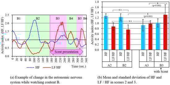 Figure 10 shows the measurement results of the autonomic nervous system. Figure 10a is an example of changes in the activity index of the parasympathetic nervous system and the sympathetic nervous system (HF and LF/HF, respectively) when a subject was watching content B. Since there are large differences between subjects regarding the responses of HF and LF/HF, the values normalized by the mean value during the experiment for each subject were used as the activity index. Therefore, they are the relative values for each scene. It was found that in scene B2, the parasympathetic nervous system was enhanced and the sympathetic nervous system was suppressed, while in scenes B3 and B5, the sympathetic nervous system was enhanced and the parasympathetic nervous system was suppressed. Changes in LF/HF, which is an index of sympathetic nervous system activity, are similar to changes in pupil diameter (Figure 8b). The reason seems to be that the dilator muscle of the pupil is controlled by the sympathetic nervous system.
