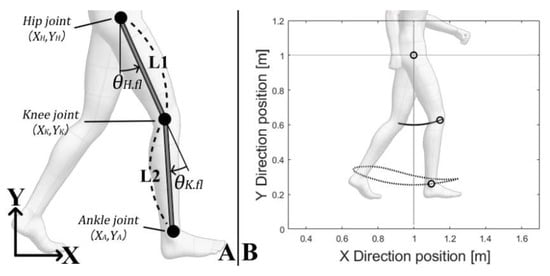 Accordingly, we attempted to estimate the trajectory of the ankle and knee joints during a gait by using the hip and knee joint angles on the sagittal plane, as well as the thigh and shin lengths. We set the definitions of the hip, knee, and ankle joints for Equations (1)–(3), and the estimated joint trajectory trends by changing the joint angle, as follows: