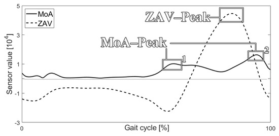 Initially, we estimated the MoA and ZAV near the ankle joint using the changes in joint angles during a gait. We then needed to devise GDC methods to use the calculated MoA and ZAV. Consequently, we found significant signs and means could be used for gait detection based on the MoA and ZAV. Figure 2 shows the pattern of MoA and ZAV during one gait cycle.