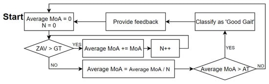 Figure 3 shows how GDC systems work. The initial state is ‘Average MoA = 0’ and ‘N = 0’. Once ‘ZAV’ is recorded over ‘GT’, ‘Average MoA’ begin to be recorded. After ‘ZAV’ is recorded under ‘GT’, the algorithm stops recording ‘Average MoA’. If derived ‘Average MoA’ is bigger than ‘AT’, classify it as ‘Good Gait’, generate feedback, and back to initial state. If derived ‘Average MoA’ is smaller than ‘AT’, back to initial state.